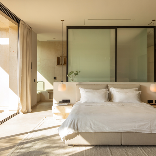 The main living level features a double-height great room with statement lighting, anchored by a sculptural staircase and accented by curated modern finishes. Upstairs, the primary suite is a true retreat: a spa-inspired bath, boutique-style walk-in closet, and walls of glass that open to the outdoors.